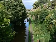 The fortress was built on a sandstone bluff, overlooking the bridge crossing the river and close to the natural harbour which is today occupied by the Chester Racecourse. The bend in the River Dee provided protection from the south and the west.[8] The river was navigable up to the sandstone ridge, so positioning the fortress beyond it would have made access to the harbour difficult.[7] The fortress may have required up to 2.4 million litres (530,000 imp gal) of water a day,[9] supplied by fresh water piped in from natural springs in the suburb of Boughton 1.6 kilometres (1 mi) to the east.[9]