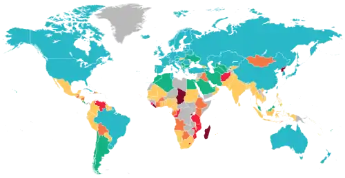 A developing country is a sovereign state with a lesser developed industrial base and a lower Human Development Index (HDI) relative to other countries.[3] However, this definition is not universally agreed upon. There is also no clear agreement on which countries fit this category.[4][5] The term low and middle-income country (LMIC) is often used interchangeably but refers only to the economy of the countries. The World Bank classifies the world's economies into four groups, based on gross national income per capita: high, upper-middle, lower-middle, and low income countries. Least developed countries, landlocked developing countries and small island developing states are all sub-groupings of developing countries. Countries on the other end of the spectrum are usually referred to as high-income countries or developed countries.