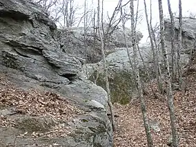 The preserve contains rugged rock formations on a ridge side, featuring a cave or rock shelter known as Devil's Den. The property was once the Robert S. Harris farm. .[1]