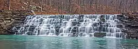 Lee Creek Valley was identified during the Great Depression as a site for a state park. Construction on the park began in 1933.[1] Devil's Den State Park was built by young men working for the Civilian Conservation Corps, which was established during the presidency of Franklin D. Roosevelt to provide work for unemployed men throughout the United States. The young men of the CCC lived in military-style barracks and constructed many of the recreational facilities at the park, including pavilions, trails and the dam and spillway on Lee Creek that forms Lake Devil.[6] The park underwent an extensive renovation in the 1970s when the CCC-built structures were refurbished.[1][7] Devil's Den State Park is recognized as one of the best preserved CCC projects in the United States.[4] It was listed on the National Register of Historic Places in 1994 for its CCC-related Rustic architecture.[8]