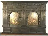 An heraldic overmantel circa 1750, survives in a back room of 7 Cathedral Close, Exeter, the former town house of the Courtenay family of Powderham, now home of the Devon and Exeter Institution. The left hand painted panel shows the arms of William Courtenay, 1st Viscount Courtenay (1711-1762): Quarterly 1st & 4th: Or, three torteaux (Courtenay); 2 & 3: Or, a lion rampant azure (de Redvers, Earl of Devon) impaling Argent, a chevron between three griffins passant sable, the arms of Finch, Earl of Aylesford, the family of his wife. The sinister supporter is one of the Finch heraldic griffins, the dexter one is the Courtenay boar. The Courtenay Latin motto is shown underneath: Ubi lapsus quid feci ("Where did I slip what have I done"). The panel on the right shows the arms of Bishop Peter Courtenay (1432–1492), Bishop of Exeter and Winchester, of the Powderham family. His arms (Courtenay, with a label of three points azure each point of the label charged with three plates for difference) are impaled by the arms of the See of Winchester, which are very similar to the arms of the See of Exeter. The whole is circumscribed by the Garter. The supporters are: dexter, the Courtenay dolphin, sinister, the Courtenay boar. The motto beneath is: Quod verum tutum ("What is true is safe").[9]