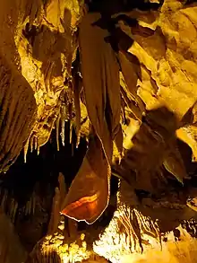 The cave is mostly limestone, which was laid in the late Mississippian Period when most of Kentucky was under a shallow warm sea.[2] There are also large deposits of calcite. Fresh water dissolves the limestone, and then deposits the mineral as the water itself loses its acidic nature.[3] Other speleothems (formations) which can be viewed at Diamond Caverns include: Soda Straws, Stalactite, Columns, Flowstone, Drapery/Bacon Strip, and Cave Pearl.[4]
