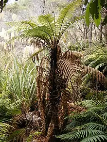 Dicksonia squarrosa, the New Zealand tree fern,[1] whekī /ˈfɛkiː/ or rough tree fern, is a common tree fern endemic to New Zealand. It has a slender black trunk that is usually surrounded by many dead brown fronds.[2]
