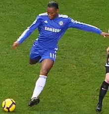 Didier Yves Drogba Tébily (French pronunciation: [didje dʁɔɡba]; born 11 March 1978) is an Ivorian former professional footballer who played as a striker.[5] He is the all-time top scorer and former captain of the Ivory Coast national team. He is best known for his career at Chelsea, for whom he has scored more goals than any other foreign player and is currently the club's fourth highest goal scorer of all time. Drogba was named Chelsea's greatest ever player in a poll of 20,000 fans conducted by Chelsea FC Magazine in 2012, and he was also named in the Chelsea team of the 2010–2020 decade by Chelsea's fans in 2020.[6][7] He is regarded as one of the greatest African players of all time and was noted for his physical strength, speed, ability in the air, powerful and accurate strikes, and ball retention. Drogba was named African Footballer of the Year twice, winning the award in 2006 and 2009. He is also the player with the most runner-up appearances (4), most third-place finishes (3), and most times in the top three (9).
