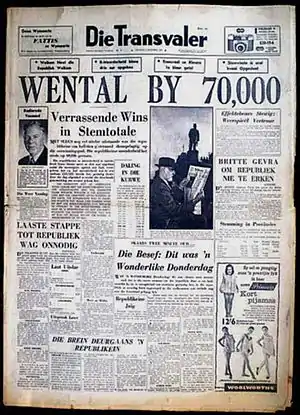 Die Transvaler was a South African newspaper founded in 1937 with the aim of promoting Afrikaner nationalism and supporting the Transvaal branch of the National Party.[1] Hendrik Verwoerd was its first editor.[2]