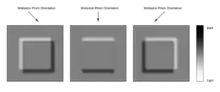 The image has the appearance of a three-dimensional object under very oblique illumination, causing strong light and dark shadows on the corresponding faces. The direction of apparent illumination is defined by the orientation of the Wollaston prisms.