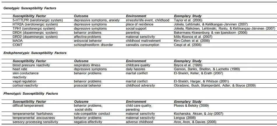 Characteristics of individuals that have been shown to moderate environmental effects in a manner consistent with the differential susceptibility hypothesis can be subdivided into three categories:[13] Genetic factors, endophenotypic factors, phenotypic factors.