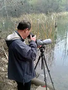 Digiscoping usually refers to using either a digital single-lens reflex camera with lens attached or, more often, a fixed lens point and shoot digital camera to obtain photos through the eyepiece of a birdwatcher's spotting scope.[1] The term has also been associated with the use of a digital camera and spotting scope equipped for prime focus photography.[2]
