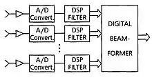 The main approach to digital signal processing in DAA is the "digital beamforming" after Analog-to-digital converters (ADC) of receiver channels or before Digital-to-analog converters (DAC) by transmission.