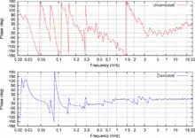 The most widely used test signal is a swept sine wave, also called chirp. This signal maximizes the measurement's signal-to-noise ratio, and the spectrum can be calculated by deconvolution, which is dividing the response's Fourier transform with the signal's Fourier transform. The spectrum is then smoothed, and a filter set is calculated, which equalizes the sound pressure levels at each frequency to the target curve. To calculate the delays and other time-domain corrections, an inverse Fourier transform is performed on the spectrum, which results in the impulse response. The impulse peak's distance from the start of the signal is its delay, and its sign is its polarity. The delay is corrected by subtracting each channel's delay from the system's peak delay, and applying this result as additional delay for the channel. This correction is sometimes provided to the user as distance from the speaker, which is calculated by multiplying the delay with the speed of sound. Inverse polarity (most likely caused by switching a speaker's + and - wires) could be fixed by multiplying each sample with -1 or swapping the speaker wire ends on one side of the cable, but this result is usually shown as a warning, as some speakers (e.g. Focal Kanta) do this intentionally.[1]