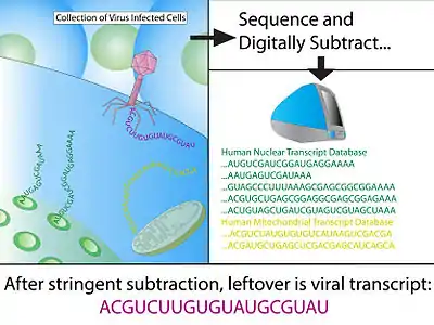 Using computational subtraction to discover novel pathogens was first proposed in 2002 by Meyerson et al.[2] using human expressed sequence tag (EST) datasets. In a proof of principle experiment, Meyerson et al. demonstrated that it was a feasible approach using Epstein–Barr virus-infected lymphocytes in post-transplant lymphoproliferative disorder (PTLD).[3]