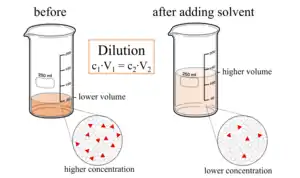 Dilution is the process of decreasing the concentration of a solute in a solution, usually simply by mixing with more solvent like adding more water to the solution. To dilute a solution means to add more solvent without the addition of more solute. The resulting solution is thoroughly mixed so as to ensure that all parts of the solution are identical.