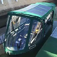 Solar propulsion[8] uses hybrid flexible solar panels integrated into the bimini top supplying power to a lithium battery bank. Twin in-hull trolling motor produce 72 pounds-force (320 N) of thrust powering the solar dinghy to 3–5 knots (3.5–5.8 mph; 5.6–9.3 km/h) depending on weather conditions. Alternate power is supplied by a propane outboard[9] for increased speed and range.