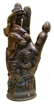 The dio- prefix in Ancient Greek Διόνυσος (Diónūsos; /di.ó.nyː.sos/) has been associated since antiquity with Zeus (genitive Dios), and the variants of the name seem to point to an original *Dios-nysos.[17] The earliest attestation is the Mycenaean Greek dative form 𐀇𐀺𐀝𐀰 (di-wo-nu-so),[18][17] featured on two tablets that had been found at Mycenaean Pylos and dated to the twelfth or thirteenth century BC. At that time, there could be no certainty on whether this was indeed a theonym,[19][20] but the 1989–90 Greek-Swedish Excavations at Kastelli Hill, Chania, unearthed, inter alia, four artefacts bearing Linear B inscriptions; among them, the inscription on item KH Gq 5 is thought to confirm Dionysus's early worship.[21] In Mycenaean Greek the form of Zeus is di-wo.[22] The second element -nūsos is of unknown origin.[17] It is perhaps associated with Mount Nysa, the birthplace of the god in Greek mythology, where he was nursed by nymphs (the Nysiads),[23] although Pherecydes of Syros had postulated nũsa as an archaic word for "tree" by the sixth century BC.[24][25] On a vase of Sophilos the Nysiads are named νύσαι (nusae).[26] Kretschmer asserted that νύση (nusē) is a Thracian word that has the same meaning as νύμφη (nýmphē), a word similar with νυός (nuos) (daughter in law, or bride, I-E *snusós, Sanskr. snusā).[27] He suggested that the male form is νῦσος (nūsos) and this would make Dionysus the "son of Zeus".[26] Jane Ellen Harrison believed that the name Dionysus means "young Zeus".[28] Robert S. P. Beekes has suggested a Pre-Greek origin of the name, since all attempts to find an Indo-European etymology are doubtful.[18][17]