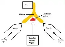 Direct-current plasma (DCP) is a type of plasma source used for atomic emission spectroscopy that utilizes three electrodes to produce a plasma stream.[1] The most common three-electrode DCP apparatus consists of two graphite anode blocks and a tungsten cathode block arranged in an inverted-Y arrangement. An argon gas source is situated between the anode blocks and argon gas flows through the anode blocks.[1][2] The plasma stream is produced by briefly contacting the cathode with the anodes. Temperatures at the arc core exceed 8000 K.[1] This three-electrode arrangement is illustrated in Figure 1.