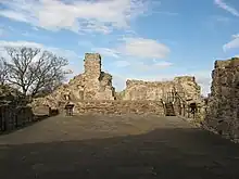In 1220, Fidra was gifted to the monks of Dryburgh Abbey by William de Vaux.[3] William's son, another John, had been held hostage in England as surety for the good conduct of King William the Lion in 1213, and succeeded to the barony in the 1220s.[3] He then began the construction of a replacement for Tarbet at Dirleton, which was recorded as a "castellum" in 1225,[4] although this may refer to an earlier timber structure.[5] In 1239, de Vaux was appointed seneschal, or steward, to Marie de Coucy, on her marriage to King Alexander II. Marie de Coucy was the daughter of Enguerrand III, Lord of Coucy (d.1242), builder of the Château de Coucy, in Picardy (c.1220s), which probably served as a model for Dirleton.[6] The 13th-century stone castle, of which only the donjon, or keep, remains, represented a show of de Vaux's status, and would have required peaceful times to permit a prolonged construction project.[7]