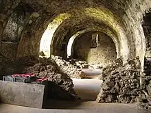 The east range itself runs the length of the east side of the castle, and originally comprised a large hall, with a square tower house at the north-east corner. Although only the basement survives, this once formed one of the finest noble residences of its time in Scotland, and would have been similar to the contemporary buildings at Doune Castle.[31] The basement is a single tunnel vault, with low walls subdividing the area into stores. Two large ovens and a well lie at the south end, while at the east is the 13th-century postern, blocked when the wall was thickened to support the new buildings above, and re-used as a fireplace.[32] At the north end of the basement is a vaulted prison for freemen, and below this, a rock-cut pit, 3 metres (9.8 ft) square, to house prisoners of the peasant classes.[32] Above the prison, but still within the basement, is a vaulted chapel with various ceremonial recesses, such as a sacristy and a piscina, or water basin.[32] A private chamber for the priest is next door. The hall above is 22 metres (72 ft) by 7.5 metres (25 ft),[26] and once had a high timber roof, and a minstrel's gallery at the south end. An ornately carved stone buffet, or cupboard, is located on this wall, which formed part of the servery next to the kitchen.[32] At the north-east corner of the castle, a tower house provided accommodation for the Lord's family and guests. Again, only the lowest floor remains, above the chapel. This probably formed a private chamber for the Lord, and was connected to the adjacent hall.[32]