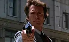 Jay Cocks of Time praised Eastwood's performance as Dirty Harry, describing him as "giving his best performance so far, tense, tough, full of implicit identification with his character."[44] Neal Gabler also praised Eastwood's performance in the film: "There's an incredible pleasure in watching Clint Eastwood do what he does, and he does it so well."[45] Film critic Roger Ebert gave the film three stars out of four, calling it "very effective at the level of a thriller" but denouncing its moral position as "fascist".[46] Gene Siskel gave the film a full four out of four stars and praised it as "one of the great police thrillers of motion picture history", though he too thought that the film's message was "dangerous".[47] Roger Greenspun of The New York Times wrote that "what makes Dirty Harry worth watching no matter how dumb the story, is Siegel's superb sense of the city, not as a place of moods but as a theater for action."[48] Kevin Thomas of the Los Angeles Times called it "a high-style film with lowbrow appeal, a movie after which you may dislike yourself for liking it as much as you do."[49] Stanley Kauffmann of The New Republic described Dirty Harry as "disgusting".[50]