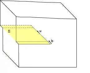 By moving a dislocation step by step through a crystal lattice, a linear lattice defect is created between parts of the crystal lattice.[3] Two types of dislocations exist: edge and screw dislocations. Edge dislocations form the edge of an extra layer of atoms inside the crystal lattice. Screw dislocations form a line along which the crystal lattice jumps one lattice point. In both cases the dislocation line forms a linear defect through the crystal lattice, but the crystal can still be perfect on all sides of the line.