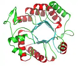 Dispersin B (also known as DspB or DispersinB) is a 40 kDa glycoside hydrolase produced by the periodontal pathogen, Aggregatibacter actinomycetemcomitans.[1] The bacteria secrete Dispersin B to release adherent cells from a mature biofilm colony by disrupting biofilm formation. The enzyme catalyzes the hydrolysis of linear polymers of N-acetyl-D-glucosamines found in the biofilm matrices. Poly-acetyl glucosamines are integral to the structural integrity of the biofilms of various Gram-positive bacteria and Gram-negative bacteria and are referred to as PIA (PNAG,PS/A) in Staphylococcus species and PGA in Escherichia coli.[2][3] By degrading the biofilm matrix, Dispersin B allows for the release of bacterial cells that can adhere to new surfaces close by and extend the biofilm or start new colonies. Currently there is interest in Dispersin B as a commercial anti-biofilm agent that could be combined with antibiotics for the treatment of bacterial infections.