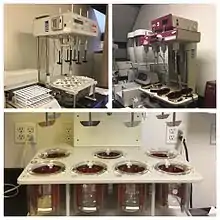 The general procedure for a dissolution involves a liquid known as Dissolution Medium which is placed in the vessels of a dissolution unit. The medium can range from degassed or sonicated deionized water to pH adjusted chemically-prepared solutions and mediums that are prepared with surfactants.[26] Degassing the dissolution medium through sonication or other means is important since the presence of dissolved gases may affect results. The drug is placed within the medium in the vessels after it has reached sufficient temperature and then the dissolution apparatus is operated. Sample solutions collected from dissolution testing are commonly analyzed by HPLC or Ultraviolet–visible spectroscopy.[27] There are criteria known as 'release specifications' that samples tested must meet statistically, both as individual values and as average of the whole.[28][29] One such criteria is the parameter "Q", which is a percentage value denoting the quantity of dissolved active ingredient within the monograph of a sample solution. If the initial sample analysis, known as S1 or stage 1 testing fails to meet the acceptable value for Q, then additional testing known as stage 2 and 3 testing is required. S3 testing is performed only if S2 testing still fails the Q parameter. If there is a deviation from the acceptable Q values at S3, then an OOS (Out of Specification) investigation is generally initiated.
