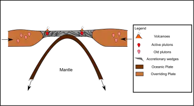 As the central oceanic plate subducts on both sides into the two overriding plates, the subducting oceanic slab brings fluids down and the fluids are released in the mantle wedge.[2] This initiates the partial melting of the mantle wedge and the magma eventually rise into the overriding plates, resulting in the formation of two volcanic arcs on the two overriding plates.[2] At the same time, sediment deposits on the two margins of the overriding plates, forming two accretionary wedges.[2] As the plate subducts and rollback occurs, the ocean becomes narrower and the subduction rate reduces as the oceanic plate becomes closer to an inverted "U" shape.[2]