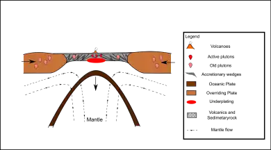 When the oceanic plate breaks apart from the crust and sinks into the mantle, underplating continues to occur. At the same time, the sinking oceanic plate starts to dewater and release the fluids upward to aid the partial melting of mantle and the crust above.[2][6] It results in extensive magmatism and bimodal volcanism.[2][6]