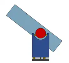 - The classical Dobsonian mount (refer to Fig.1) consists of a flat horizontal "ground board" platform (Fig.1, black) on top of which are attached three of the seven supports (Fig.1, bottom yellow). Upon these three supports rests a box construction called a "rocker box" (Fig.1, dark blue). A loose center-bolt (Fig.1, dark green) keeps the rocker box centered and allows it to pivot above the ground board. On opposing sides of the rocker box, semicircular depressions are cut out from the top edge of each wall (the rocker box is open on the top and on the back). Each depression has a widely spaced pair of supports installed in the cut (Fig.1, top yellow). The telescope optical tube assembly (OTA, Fig.1, light blue) has two large round trunnions (or arc-shaped rails for larger telescopes) secured on the left and right sides (Fig.1, red). Their common axis intersects the center of gravity of the telescope OTA. The trunnions (commonly known as altitude bearings) rest atop the aforementioned four supports in the top cutouts of the rocker box. To raise the telescope (altitude), just lift the tube and the trunnions will slide over the four supports. To move the telescope left or right (azimuth), push or pull the top rim of the OTA (some have a dedicated handle) so that the pivoting rocker box slides over the ground board's three supports.