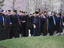 When the dissertation is ready, the faculty names two expert pre-examiners with doctoral degrees from the outside the university. During the pre-examination process, the student may receive comments on the work and respond with modifications.[83] After the pre-examiners approve, the doctoral candidate applies the faculty for permission to print the thesis. When granting this permission, the faculty names the opponent for the thesis defence, who must also be an outside expert, with at least a doctorate. In all Finnish universities, long tradition requires that the printed dissertation hang on a cord by a public university noticeboard for at least ten days prior to for the dissertation defence.[84]