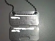Additionally, the right hand side of each half-tag is engraved DANMARK (Danish for 'DENMARK').[25] Starting in 1985, the individual's service number (which is the same as the social security number) is included on the tag. In case the individual dies, the lower half-tag is supposed to be collected, while the other will remain with the corpse. In the army, navy, and air force but not in the national guard, the individual's blood type is indicated on the lower half-tag only, since this information becomes irrelevant if the individual dies. In 2009, Danish dog tags were discontinued for conscripts.[26]