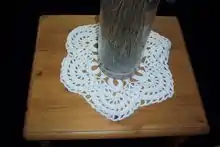 A crocheted doily in use