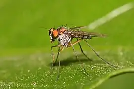 Many studies have shown that Dolichopodidae give visual, rather than chemical or other signals during courtship.[9] The males of many species exhibit elaborate secondary sexual characters assumed to aid in species recognition during courtship. These characters include flaglike flattening of the arista and tarsi, strongly modified setae and projections of the tarsi, the prolongation and deformation of podomeres, orientated silvery pruinosity, and maculation or modification of the wings.