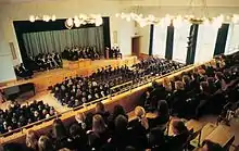 William Playfair was commissioned to design the building. The interior of the Playfair Building was gutted by a fire in 1961, but Playfair's Greek-style outer facades remained intact. The interior was rebuilt on a plan based on central corridors with equal sized classrooms on both sides. An extra (second) floor was concealed, increasing the total available space.[9] The school was re-opened in 1966 by former pupil Lord Heyworth, and the assembly hall was rebuilt after the fire. The school library is a "whispering gallery" because of its domed ceiling.