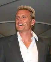 On the set of the James Bond film A View to a Kill, Jones suggested that he try out for a part in the film, which led to his feature film debut playing the very minor role of a suited KGB henchman named Venz.[22][23] In the film, Lundgren appears in the scene in which the KGB's General Gogol (Walter Gotell) confronts Max Zorin (Christopher Walken) about leaving the KGB, at a racing ground and ends in a minor brawl in which Lundgren's character Venz points a gun at Zorin. Roger Moore, in his last performance as James Bond, once memorably said, "Dolph is larger than Denmark".[19] Lundgren found the entertainment business more attractive and rewarding than chemical engineering, so he decided to pursue a career in acting despite having no formal training.[19] Upon learning that Sylvester Stallone was seeking an imposing fighter to play Ivan Drago in Rocky IV (1985), Lundgren sent videos and pictures of himself to a distant contact of Stallone, eventually reaching him. Lundgren tried out for the role, but as he himself has stated, he was initially turned down because he was too tall.[22]