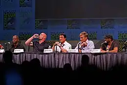 In 2010, Lundgren made a guest star appearance on the TV series Chuck in the fourth-season premiere episode, "Chuck Versus the Anniversary", as Russian spy Marco, with references to Rocky IV's Ivan Drago.[30] He then played a drug-addled assassin in the ensemble action film The Expendables. It was his first American theatrically released film since 1995. The film is about a group of elite mercenaries, tasked with a mission to overthrow a Latin American dictator. It was described by Lundgren as "an old-school, kick-ass action movie where people are fighting with knives and shooting at each other."[114] Film production began on 3 March 2009, with a budget of $82 million.[115] Filming commenced 25 days later in Rio de Janeiro and other locations in Brazil, and later in Louisiana. The film received mixed reviews from critics but was very successful commercially, opening at number one at the box office in the United States, the United Kingdom,[116] China[117] and India.[118]