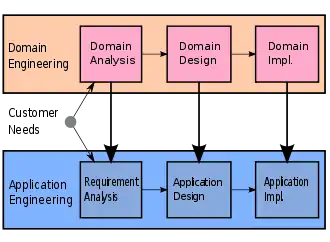 Domain engineering focuses on capturing knowledge gathered during the software engineering process. By developing reusable artifacts, components can be reused in new software systems at low cost and high quality.[6] Because this applies to all phases of the software development cycle, domain engineering also focuses on the three primary phases: analysis, design, and implementation, paralleling application engineering.[7] This produces not only a set of software implementation components relevant to the domain, but also reusable and configurable requirements and designs.[8]
