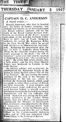Captain Donald Clive Anderson (18 April 1897 – 2 January 1957)[1][2] was an English military consultant and historian. He joined the British Indian Army before fighting in the Mesopotamia and Palestine in World War I. Anderson toured Australia before working in Sudan on The Four Feathers film in 1939,[3] working for the Ministry of Information during World War II, and following the war working on Festival of Britain.