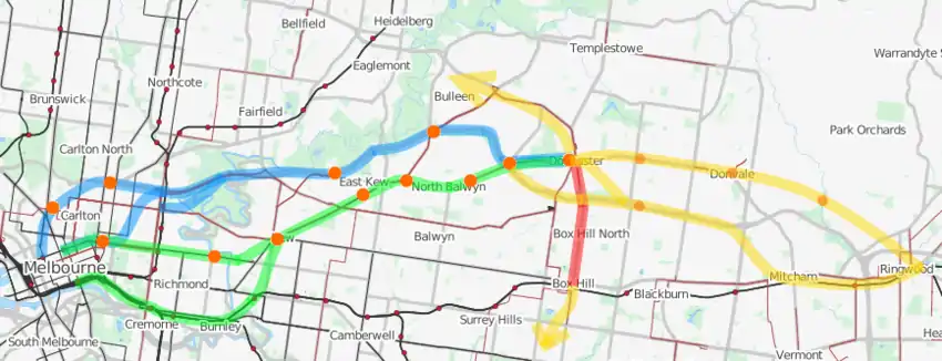 - Orbital Network: “South to Box Hill” - a connection from Box Hill railway station; now being constructed as part of the Suburban Rail Loop