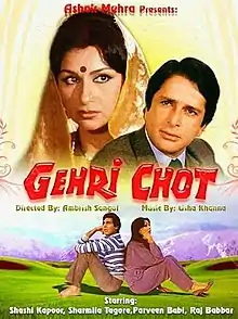 Gehri Chot, also released as Door-Desh, is a 1983 Indian-Canadian Hindi-language crime-drama film directed by Ambrish Sangal, starring Shashi Kapoor and Sharmila Tagore in the lead roles with Raj Babbar, Parveen Babi, David Abraham, Nadeem Baig, and Bobita in supporting roles. This was both Pakistani actor Nadeem and Bangladeshi actress Bobita's only appearance in a Bollywood film.[1][2][3] It was a Bangladesh–Indian joint production film. This was also the last time veteran actor David Abraham appeared in a movie, filmed shortly before his death in 1982.