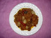 Dopiaza (Persian: دوپیازه, meaning "two onions", is the name of two separate dishes, one in the Greater Iran region and one in South Asia. It refers to a family of recipes, typically meat-based, that contain onions as a major ingredient. There are two alternative etymological explanations for its name.