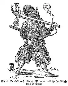 Doppelsöldner ("double-mercenaries", "double-pay men",[1] from German doppel- meaning double, Sold meaning pay) were Landsknechte in 16th-century Germany who volunteered to fight in the front line, taking on extra risk, in exchange for double payment. The stated ratio was that one Landsknecht in four would be a Doppelsöldner. The Doppelsöldner of each company were usually issued with ranged weapons, such as a crossbow or an arquebus, and arranged in the wings of a square, in front of the pikemen.[2]