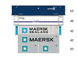 Intermodal containers shipped by rail within North America are primarily 53 feet (16.15 m) long, with trailer-on-flat-car (TOFC) units used as well. The 53-foot length reflects a common maximum length for highway semi-trailers, which varies by state.[11] Major domestic intermodal carriers include:
