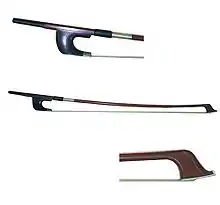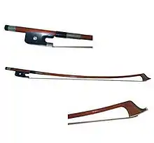 The German bow (sometimes called the Butler bow) is the older of the two designs. The design of the bow and the manner of holding it descend from the older viol instrument family. With older viols, before frogs had screw threads to tighten the bow, players held the bow with two fingers between the stick and the hair to maintain tension of the hair.[21] Proponents of the use of German bow claim that the German bow is easier to use for heavy strokes that require a lot of power.