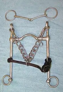 The curb bit, or Weymouth, consists of a mouthpiece with shanks and a curb chain. In USDF competition, the lower shank may be no longer than 10 cm (about 4")[1][4] in length. With a sliding mouthpiece, this measurement is taken when the mouthpiece is at its highest point. The width of the curb bit is also important: a curb that is too narrow will cause the shanks to pinch the lips, one that is too wide will cause the lips to be pinched between the curb and the curb chain and may also cause it to lie unevenly in the mouth.[4] The upper shank should bend slightly outward, to prevent it from pinching when the reins are pulled. The severity of the curb is determined by several factors: longer shanks are considered more severe, as are tighter or thinner curb chains and higher ports.[1]