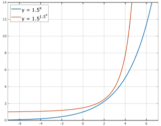 A double exponential function is a constant raised to the power of an exponential function. The general formula is (where a>1 and b>1), which grows much more quickly than an exponential function. For example, if a = b = 10: