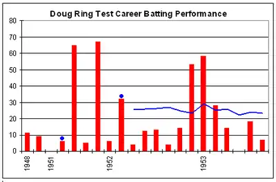 The fifth Test, which saw the debut of Richie Benaud alongside Ring, was an anticlimax, and Ring contributed little with either bat or ball to a large Australian victory.[31] In the series as a whole, among the regular players, Ring finished behind only Hassett and Miller as a batsman, with 197 runs at an average of 28.14, and he took 13 wickets for exactly 30 apiece.[32]