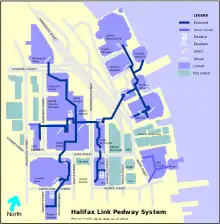 The Downtown Halifax Link system is a network of climate-controlled pedways (pedestrian tunnels and skywalks) connecting various office buildings, hotels, parkades, and entertainment venues around downtown Halifax, Nova Scotia, Canada. It is similar to Toronto's PATH or Montreal's RÉSO system, but on a much smaller scale. These walkways are all open to the public, and are convenient during inclement weather and the winter months.