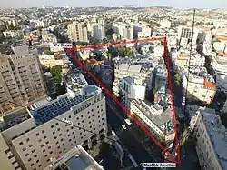 The land used for the Downtown Triangle had been purchased by the Jewish Colonization Association from the Greek Orthodox Patriarchate,[3] which began selling off some of its holdings in Jerusalem after World War I.[4] The British developed the field into a triangular district (hence its appellation, "The Triangle"[2]) demarcated by Jaffa Road, Ben Yehuda Street (constructed by the British in 1922) and King George Street (constructed by the British in 1924).[1] Lots were sold to large companies and cooperatives as well as private businesses.[2] Other streets adjacent to the Triangle – Shlomzion Hamalka, Mamilla, Agron, and King David Streets – were zoned for commercial and residential use.[2]