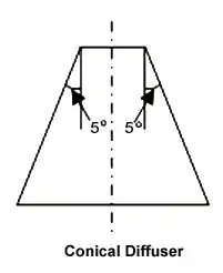 - Conical diffuser or straight divergent tube – This type of draft tube consists of a conical diffuser with half angle generally less than equal to 10° to prevent flow separation. It is usually employed for low specific speed, vertical shaft francis turbine. Efficiency of this type of draft tube is 90%