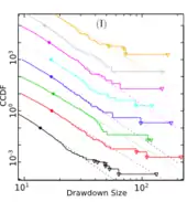 The 5000 largest drawdowns for 8 different futures contracts plotted according to their empirical CCDF, shifted by factors of 10 for visibility. The dashed lines are power law fits.[7]